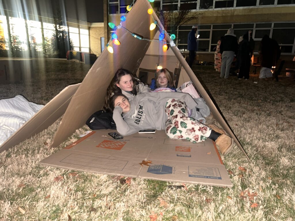 Shown in in their makeshift tent comprising cardboard boxes are (counterclockwise): Leah Croce, Mia Theiss Charlotte Sempre.
