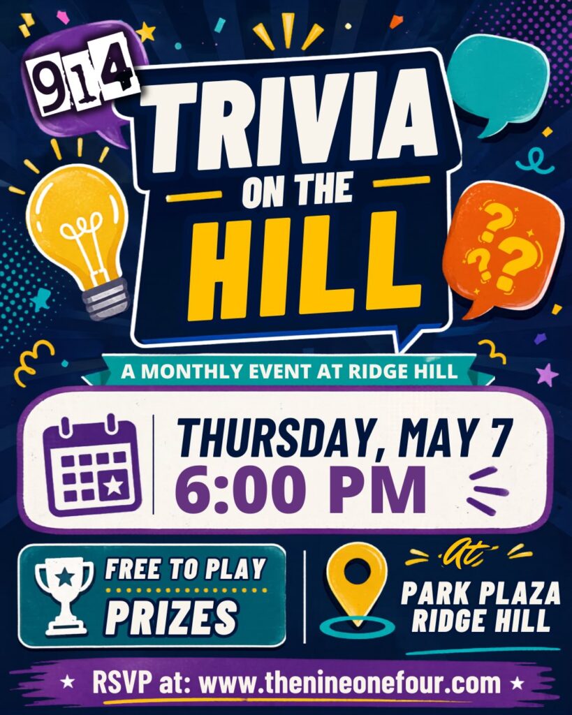Trivia on the Hill is coming to Park Plaza at Ridge Hill next Thursday, May 7th — free to play, open to all, and yes, there are prizes.
