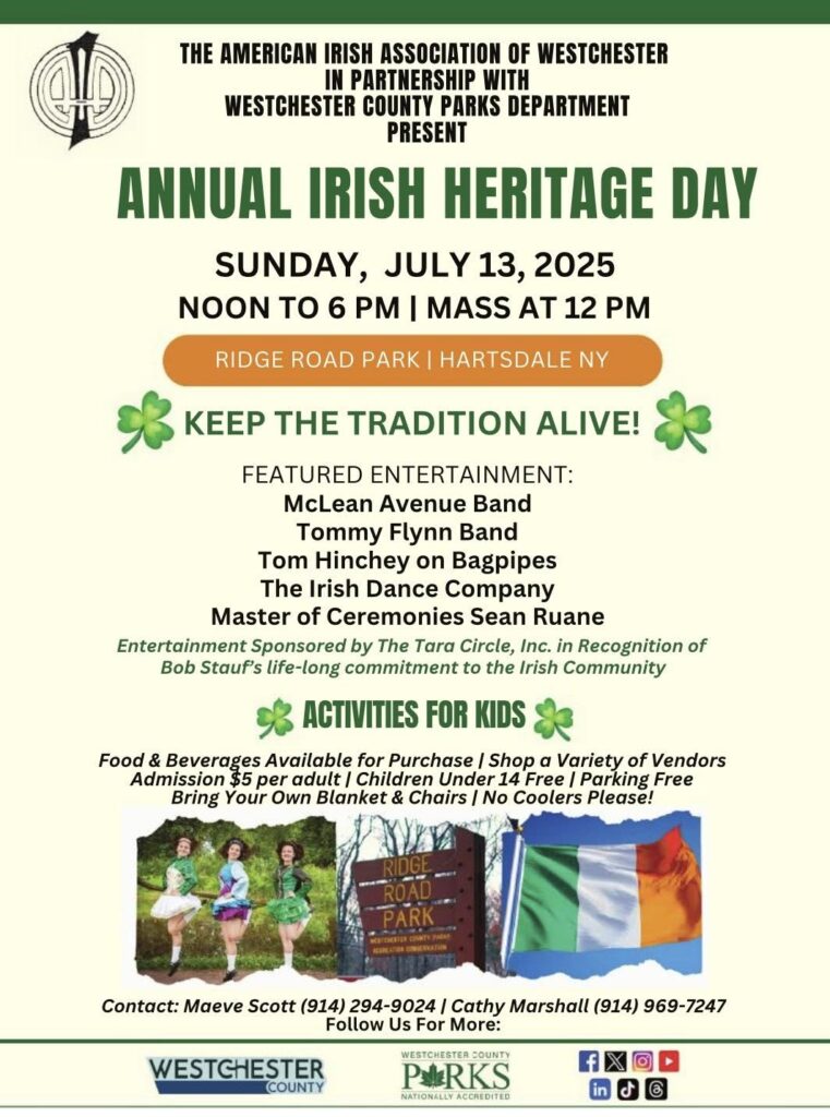 The American Irish Association of Westchester (AIAW) in partnership with Westchester County Parks Department is excited to announce its annual Irish Heritage Day Festival on Sunday, July 13 from 12 to 6 p.m. at Ridge Road Park in Hartsdale.