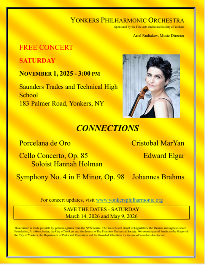 The Yonkers Philharmonic Orchestra, presented by the Fine Arts Orchestral Society of Yonkers, Inc., is dedicated to promoting the appreciation of live music in Yonkers and beyond. We provide enriching musical experiences for audiences of all ages. Our concerts are made possible by generous grants from the NYS Senate, The Westchester Board of Legislators, the Thomas and Agnes Carvel Foundation, ArtsWestchester, the City of Yonkers and the donors to The Fine Arts Orchestral Society. We extend special thanks to the Mayor of the City of Yonkers, the Department of Parks and Recreation and the Board of Education for the use of Saunders’ Auditorium.