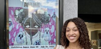 Artist “Othelia” with her featured artwork “Family Photo” in front of Blue Door Art Center, Photo by...