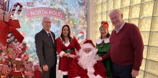 From left, Saint Joseph’s Medical Center President & CEO Michael J. Spicer; Cristal Lucero (Mrs. Claus); Dr....
