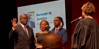 Ken Jenkins takes the oath of office from Judge Anne Minihan, with wife Deborah Hudson-Jenkins, and son...
