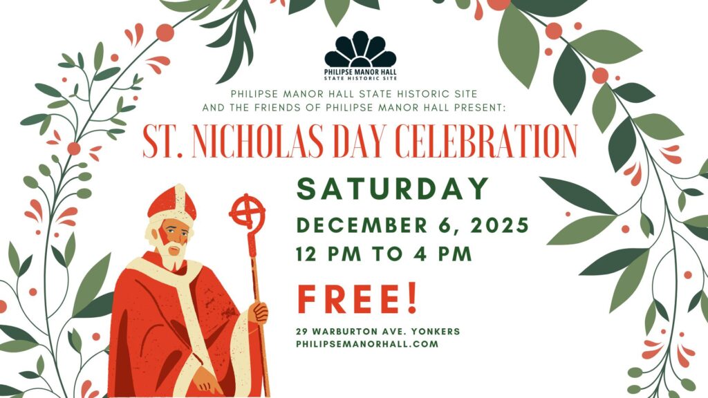 Come one, come all! Join us next Saturday, December 6, 2025 at 12:00 PM at Philipse Manor Hall State Historic Site (29 Warburton Ave. Yonkers, NY) for our annual St. Nicholas Day Celebration! With visits from St. Nicholas himself, live music and stories by storyteller April Armstrong, gingerbread cookie decorating, pomanders, ornament crafts, and more, this fun, kid-focused celebration is not to be missed!