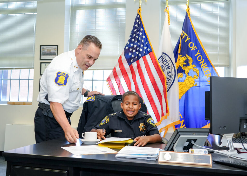 13-year-old Devarjaye ‘DJ’ Daniel, a teen battling cancer who has been sworn into thousands of law enforcement agencies nationwide, spent an unforgettable day with Yonkers Police Department.