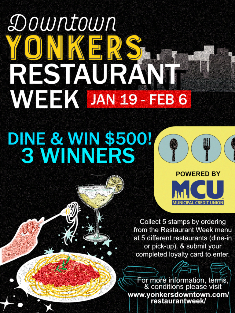 Food lovers, mark your calendars! Yonkers Downtown Restaurant Week is back to kick off the new year with delicious dining. The Yonkers Downtown/Waterfront Business Improvement District (YDWBID) invites residents and visitors to this annual culinary celebration, running from January 19 through February 6 throughout downtown Yonkers. The event features special prix-fixe lunch and dinner menus, flexible dining options, and an exciting new incentive: 3 chances to win $500 gift cards, added this year to thank the community for its continued support. Diners can enter to win by picking up a restaurant loyalty card (available at any participating restaurant), ordering from the Restaurant Week menu at 5 participating restaurants, and having their loyalty card stamped. We thank this year’s sponsor, Municipal Credit Union, for their support in making this new initiative possible, and our in-kind sponsor, RXR, for generously providing a $500 gift card.
