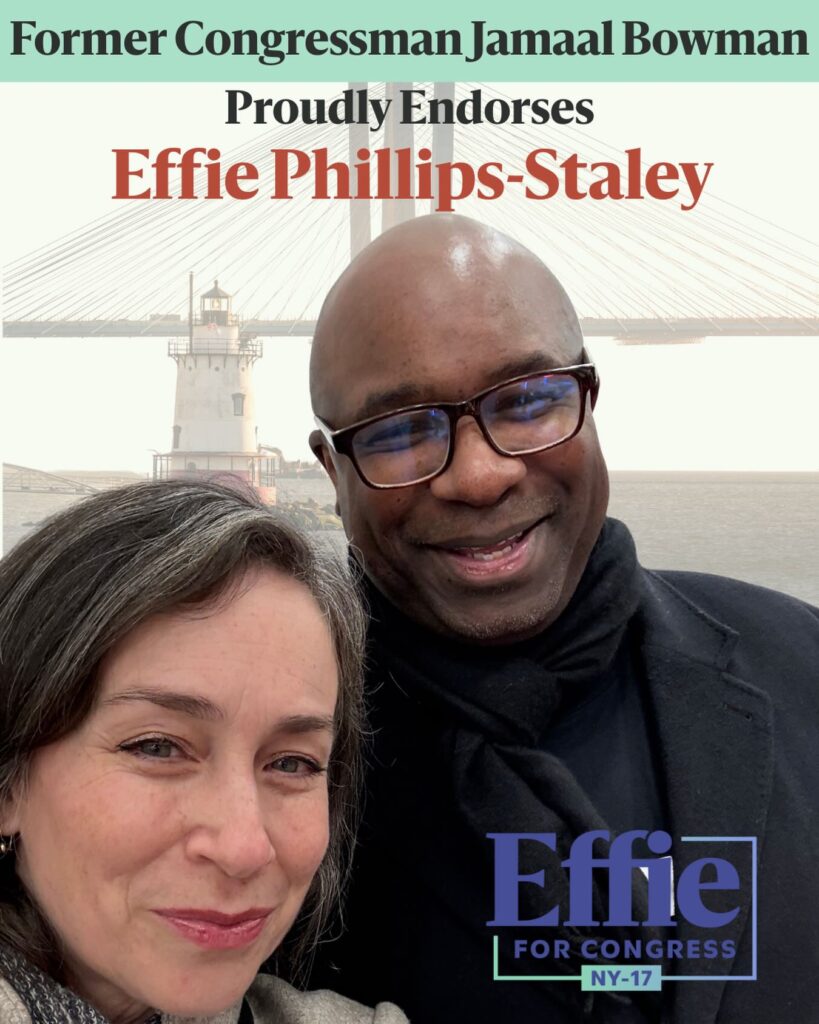 Former Congressman and national progressive leader Jamaal Bowman endorsed Effie Phillips-Staley in her race to become the Democratic nominee in NY17. Mr. Bowman, whose former district was directly south of NY17,  represents the first major national figure to support a Democratic candidate in the race to unseat MAGA Republican Mike Lawler. Bowman’s endorsement solidifies Phillips-Staley’s status as the only progressive candidate in the field, and the strongest candidate to motivate Democratic voters hungry for change to turn out in November’s election.