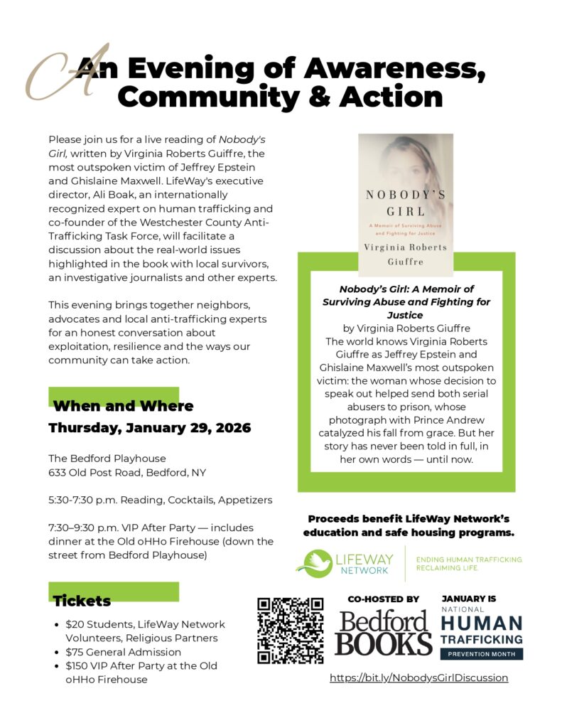 LifeWay Network Executive Director Ali Boak will moderate the program, with Assemblymember Chris Burdick delivering opening remarks. Tara Rosenblum, senior investigative reporter at News 12, and Kiki Jimenez, a survivor and advisory board member for the Westchester County Anti-Trafficking Task Force, will read excerpts from Nobody’s Girl and join the discussion.