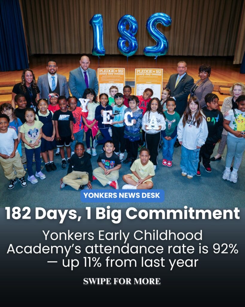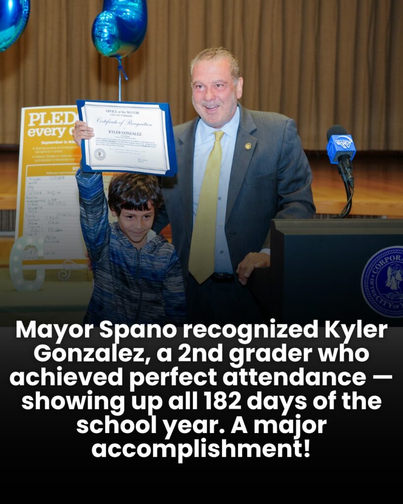 On June 9, at the Yonkers Early Childhood Academy, Mayor Mike Spano, Schools Superintendent Aníbal Soler, Jr., Yonkers Early Childhood Academy Principal Stefanie Felidi, and Councilwoman Tasha Diaz, along with students, teachers and staff recognized one very dedicated student for achieving perfect attendance by attending all 182 days of the school year. Additionally, 143 students in grades 1 and 2 who committed to honoring the Pledge 182 campaign will be awarded a pizza party.