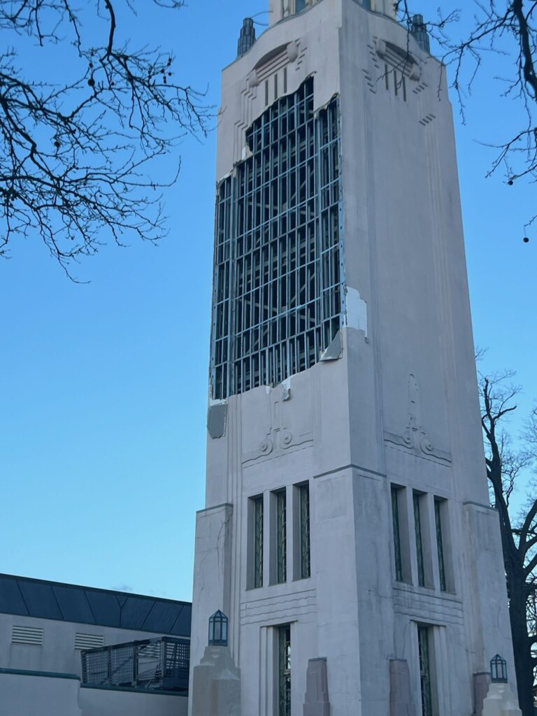 Due to high winds overnight, the Music Tower at Playland has sustained external damage. Sections of stucco and underlying foam detached, and the area behind the structure has been closed to cars and pedestrians as a precautionary measure until a full assessment can take place. Clean up of the area is underway.