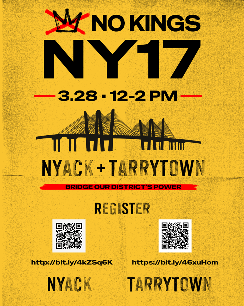 NO KINGS NY17 – THIS Saturday, March 28, 12 Noon across Westchester and Rockland, with NY-17 at center stage with sister rallies at Pierson Park in Tarrytown and Memorial Park in Nyack.