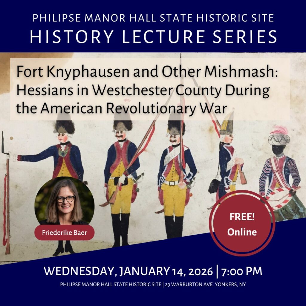 Philipse Manor Hall State Historic Site and the Friends of Philipse Manor Hall are pleased to present a talk by Penn State historian Friederike Baer entitled “Fort Knyphausen and Other Mishmash: Hessians in Westchester County During the American Revolutionary War”.Dr. Baer was most recently seen in the Ken Burns Documentary “The American Revolution.” The talk will be available online at YouTube Live on Thursday, January 14, 2026 at 7:00 PM.