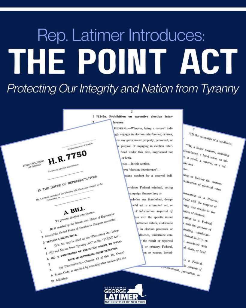 U.S Congressman George Latimer (D-NY) introduced the Protecting Our Integrity and Nation from Tyranny (POINT) Act, legislation to prevent the President or any agent of the Executive Branch from attempting to influence or prevent the administration of an American election.