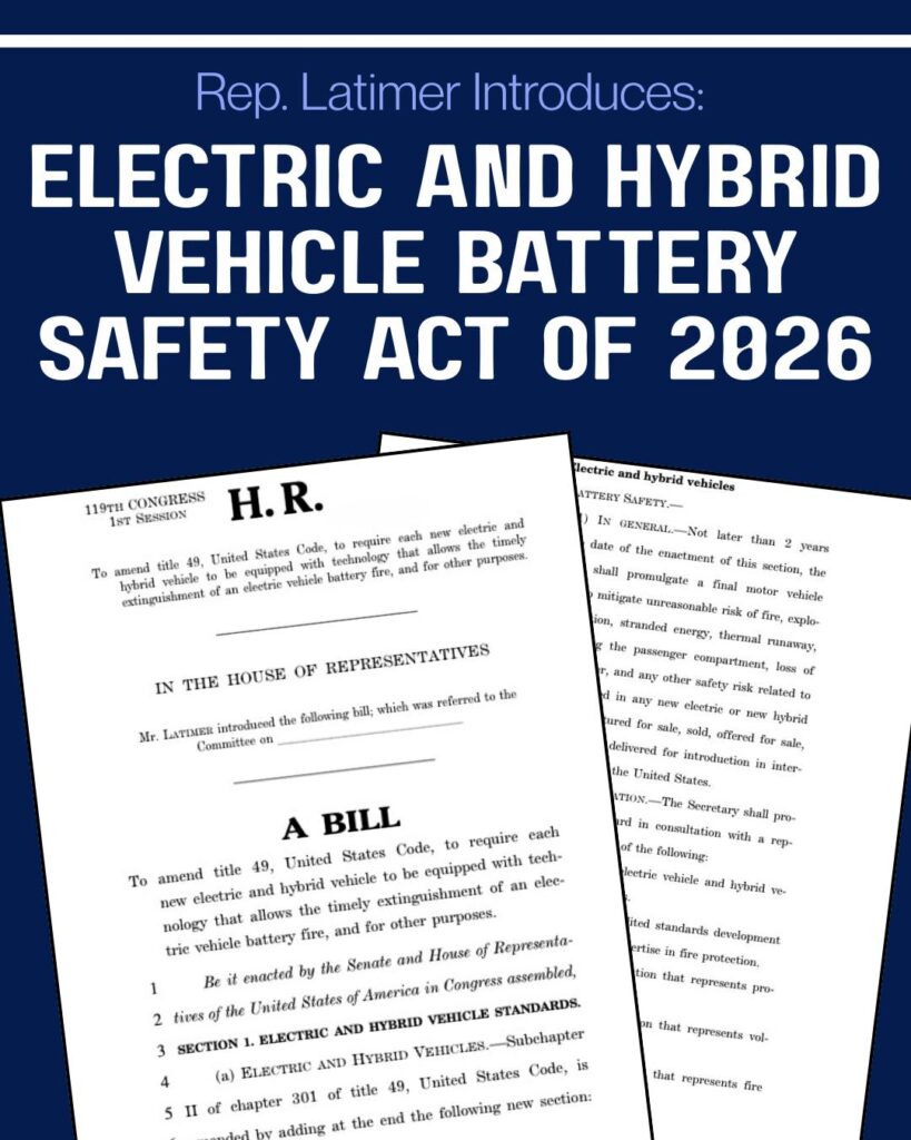 Today, U.S. Congressman George Latimer (D-NY) and Congressman Rob Bresnahan, Jr. (R-PA) introduced the Electric and Hybrid Vehicle Battery Safety Act of 2026, bipartisan legislation focused on diminishing the risk of injury and death from battery fires in electric and hybrid vehicle accidents and supporting firefighters’ ability to extinguish such fires safely and effectively when they occur.
