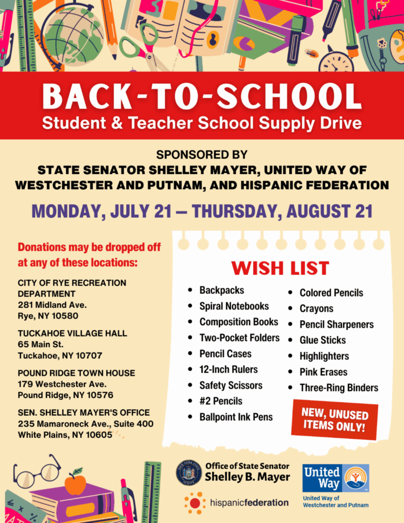 Senator Shelley Mayer said, “I am very pleased to partner with the United Way of Westchester and Putnam Counties to host my annual Back to School Drive. Every new school year brings countless opportunities and experiences for our students, making it an exciting time for learning and growth. However, many of our neighbors and friends – particularly this year – struggle to afford essential school supplies. If you are able, I encourage you to donate any items you can. I thank United Way of Westchester and Putnam for recognizing this need and co-sponsoring this drive with me to ensure that students and teachers have the resources they need to start the school year. I also thank Tuckahoe Village Hall, Rye City Hall, and Pound Ridge Town House for providing their spaces as drop-off locations. I deeply appreciate the generosity of our community.”