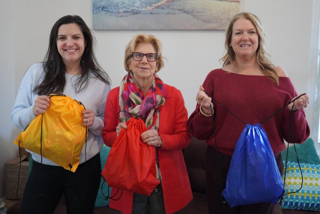 Kastner, Mayer, and Boak holding the bags the St. Thomas Mar Thoma Church Youth Fellowship put together