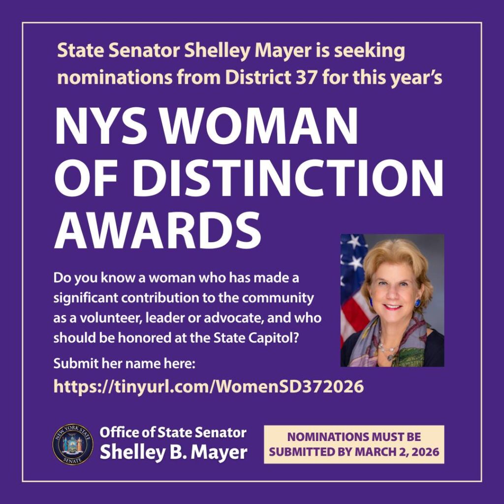 Senator Shelley B. Mayer said, “It is an honor to represent so many extraordinary people in the 37th SD in the New York State Senate and to have the opportunity to recognize them for their contributions that make our communities great. If you know someone who fits the descriptions, I encourage you to submit their nomination. The selected recipients will be honored in ceremonies in Albany.”