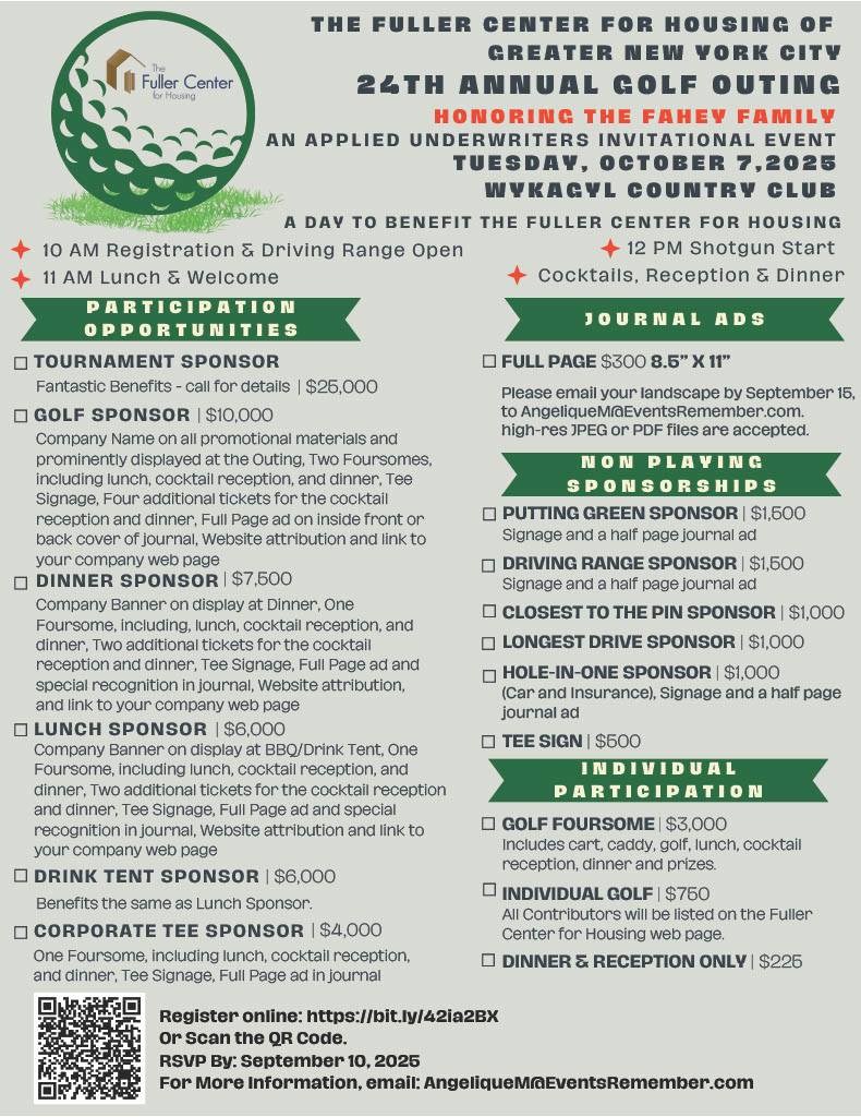 NewsCommunitySports The Fuller Center for Housing of Greater NYC-24th Annual Golf Outing-October 7-Wykagyl Golf Club September 5, 2025 Facebook Twitter