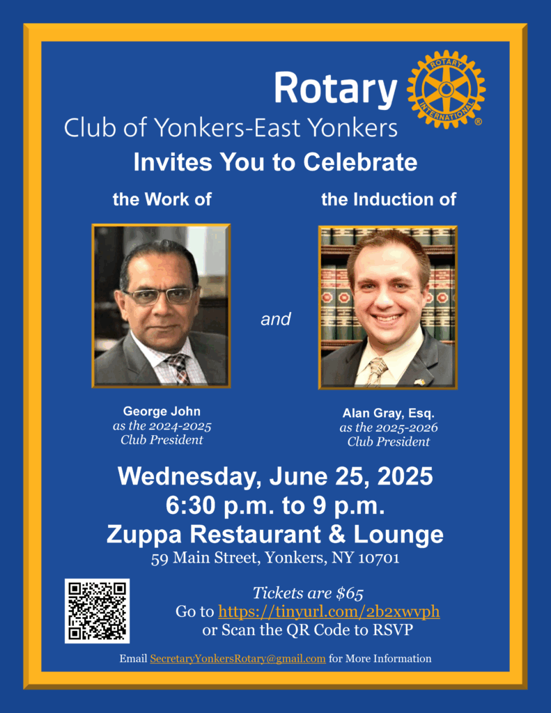 The Rotary Club of Yonkers-East Yonkers will be holding its annual Presidents’ Dinner on Wednesday, June 25 at 6:30 p.m. at Zuppa Restaurant & Lounge in Yonkers.