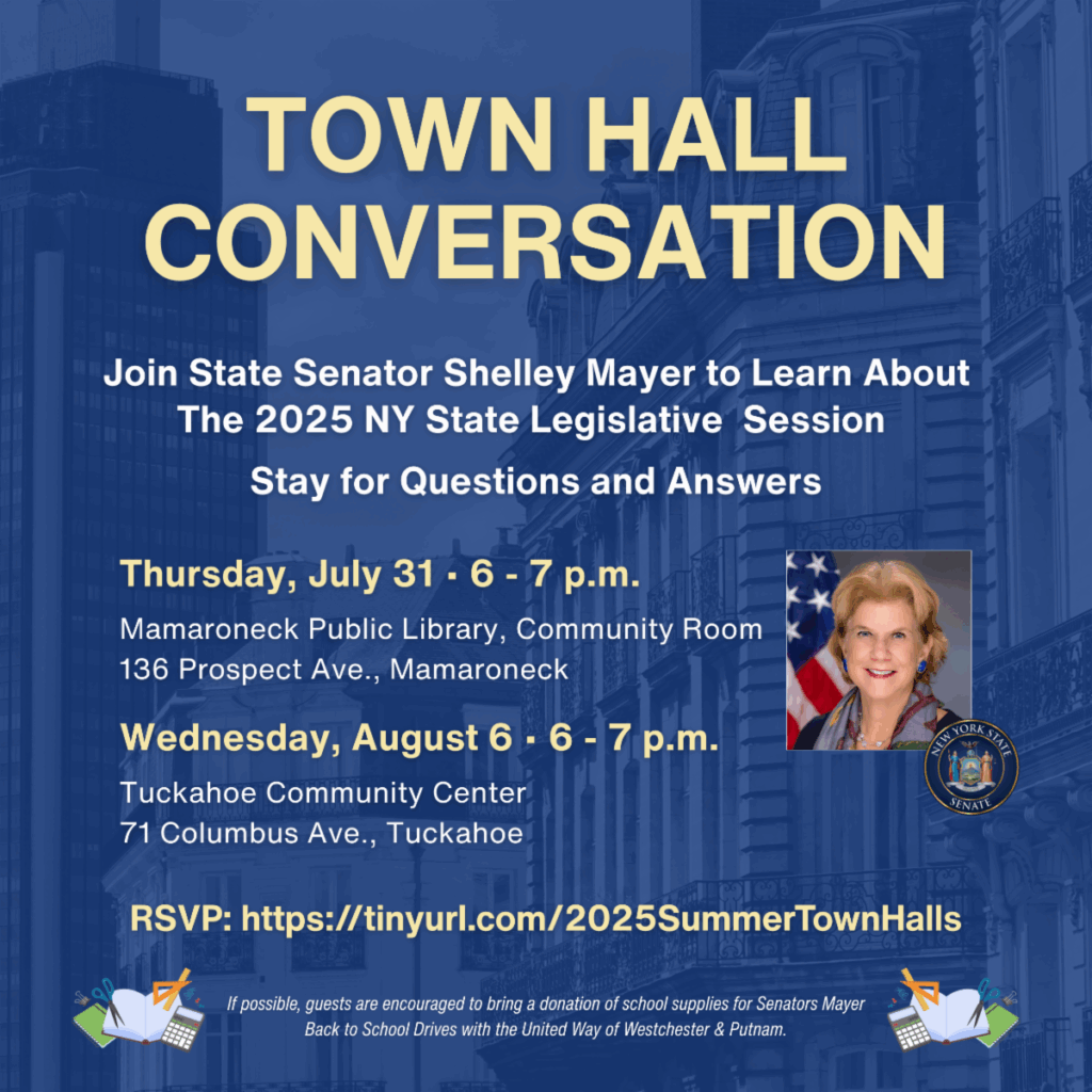 Join Senator Mayer to learn about the 2025 New York State Legislative Session, and stay for questions and answers. Thursday, July 31, 6 – 7 p.m. at the Mamaroneck Public Library (Community Room), 136 Prospect Ave., Mamaroneck; and Wednesday, August 6, 6 – 7 p.m. at the Tuckahoe Community Center, 71 Columbus Ave., Tuckahoe. RSVP here. A Town Hall for Northern Westchester will be announced soon.