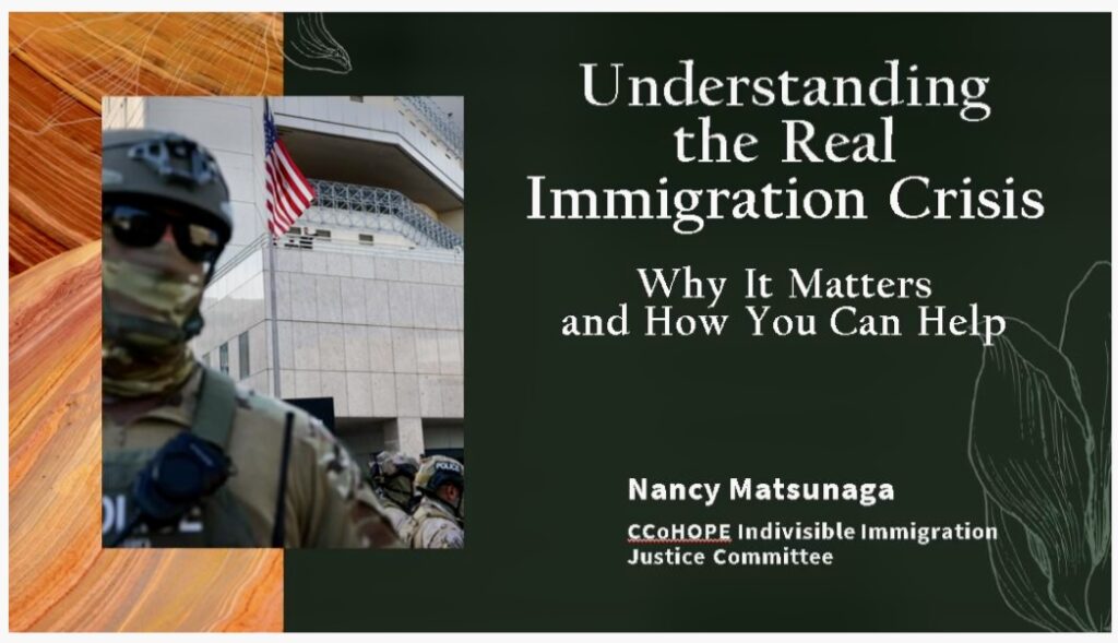 The event will feature Nancy Matsunaga of the CCoHOPE Indivisible Immigration Justice Committee, who will discuss migration pathways, legal obstacles, and proposed reforms such as NY4All and the Dignity Not Detention Act, followed by a Q&A. The program aims to inform the community and highlight ways residents can support immigrant neighbors.