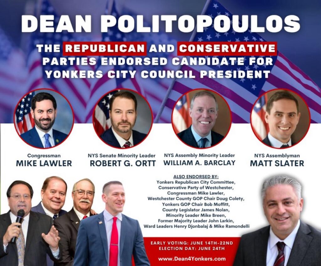 We endorse Dean Politopolous in the republican primary for Yonkers City Council President June 24.