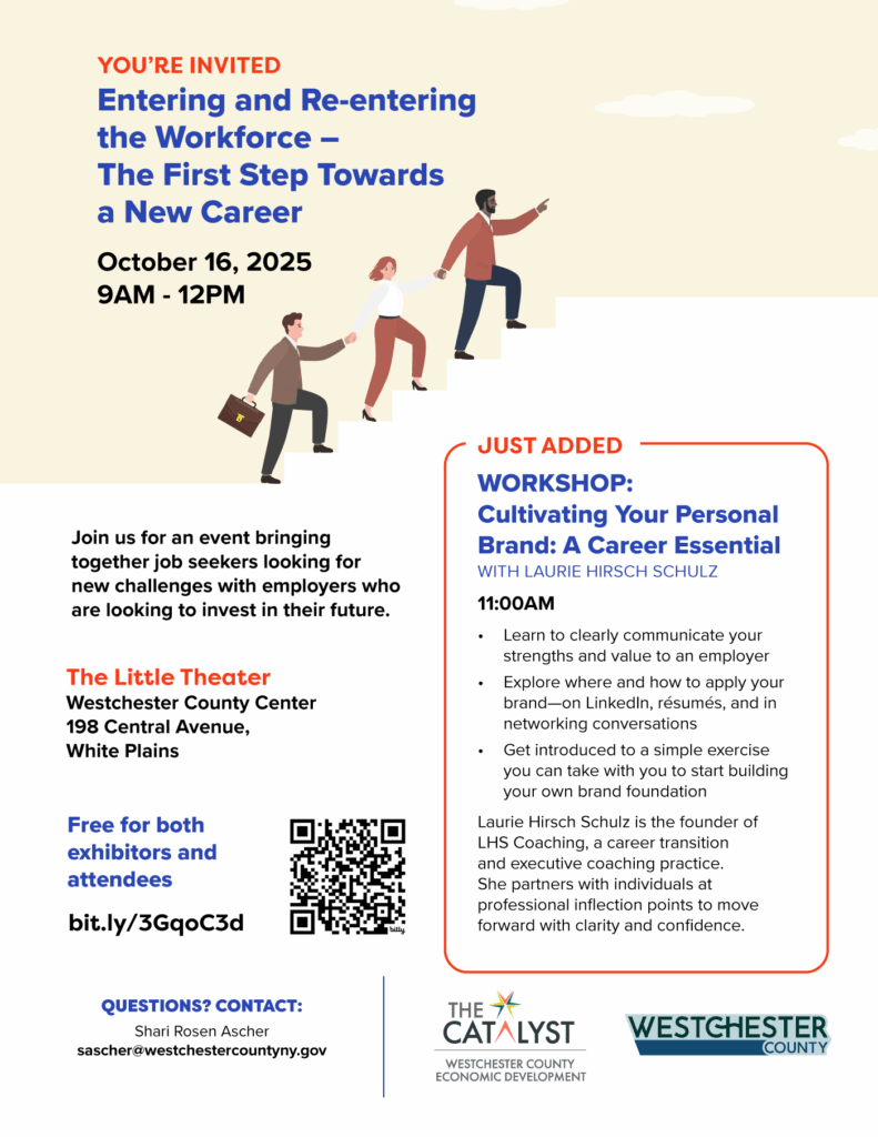 Following a successful debut in 2024, Westchester County is pleased to announce the Entering and Re-entering the Workforce Job Fair. This free event is designed for those who are new to employment, looking for a new employment opportunity, retired from one career, and seeking to start a new chapter, and more.