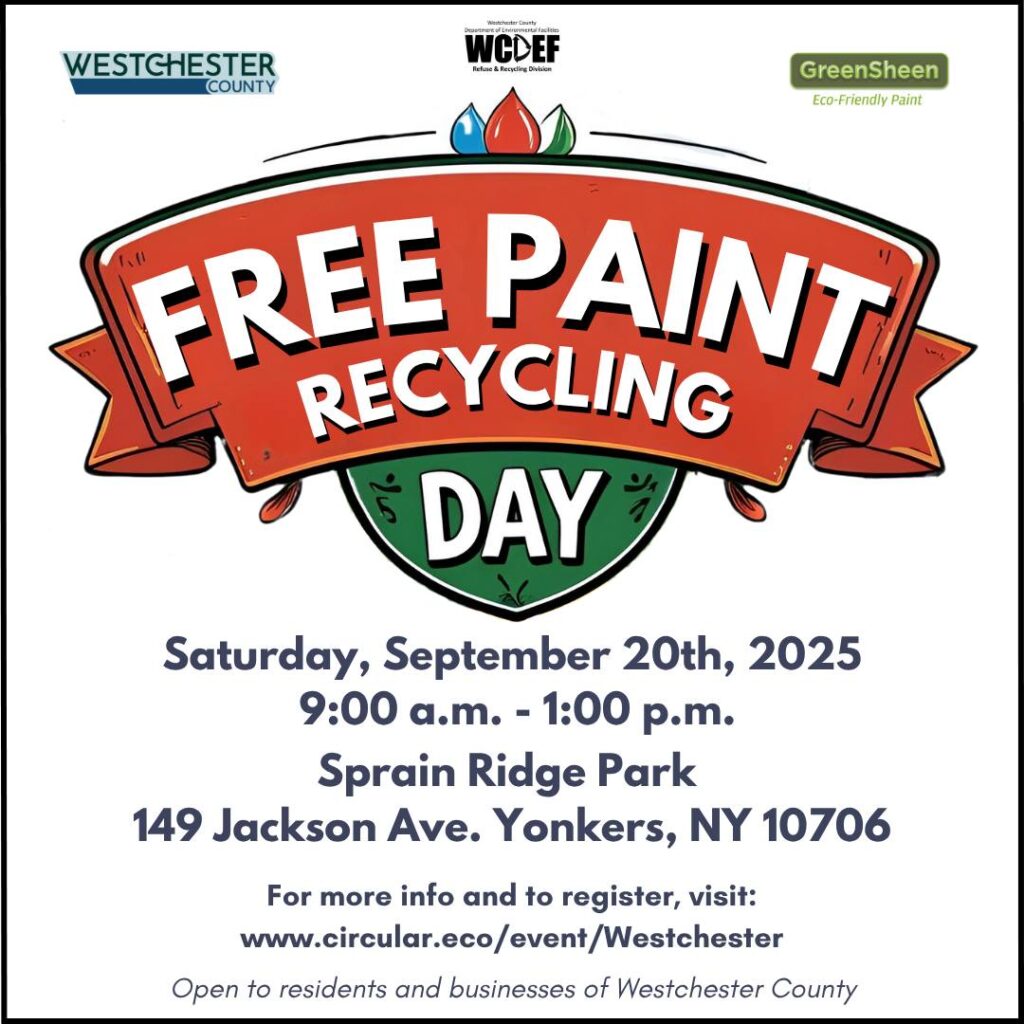 Westchester County’s Department of Environmental Facilities (WCDEF) will be hosting a free Paint Recycling Day in partnership with GreenSheen Paint.