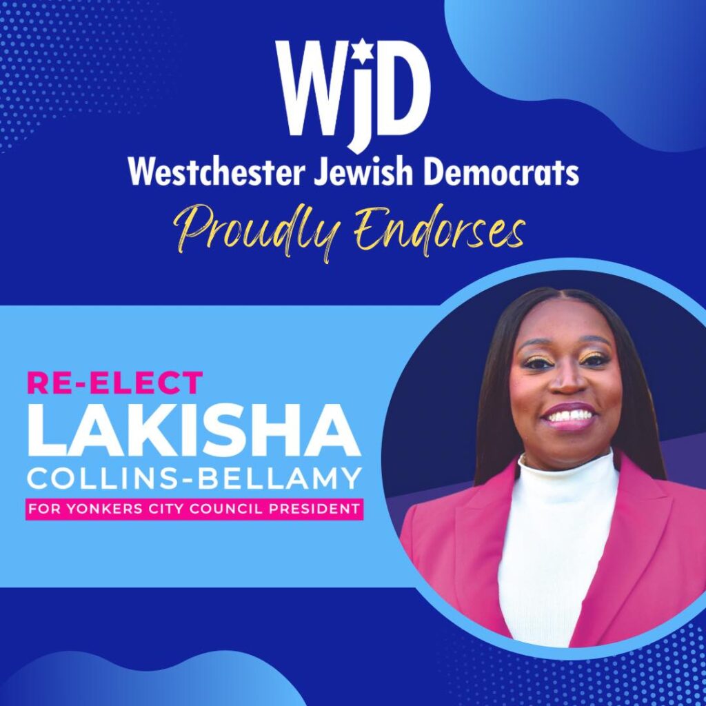 “It’s an honor to receive the support of the Westchester Jewish Democrats,” said Lakisha Collins-Bellamy. “I’ve been proud to stand with the Yonkers Jewish Community in my role as City Council President. Together, we’re working to build a Yonkers that is safe, inclusive, and free from antisemitism and hate.”