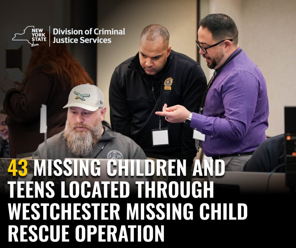 The New York State Division of Criminal Justice Services (DCJS) today announced that 43 children and teens reported missing to police in Westchester County have been located through the Westchester Missing Child Rescue Operation. The operation, coordinated by the DCJS Missing Persons Clearinghouse in partnership with the state Office of Children and Family Services, and the National Child Protection Task Force, leveraged the experience, expertise and resources of more than 70 local, state, and federal law enforcement agencies, nonprofit organizations, and private partners to provide critical investigative support to local police departments.