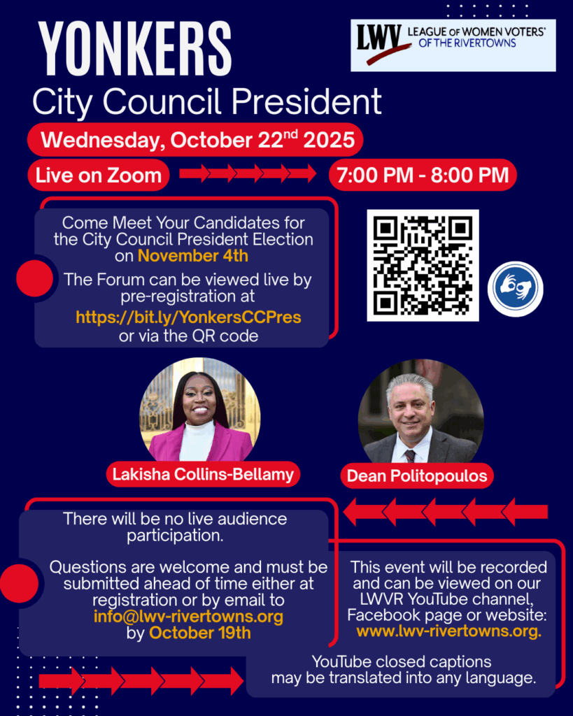 The event will be recorded and made available on the League’s YouTube channel, LWV Rivertowns,