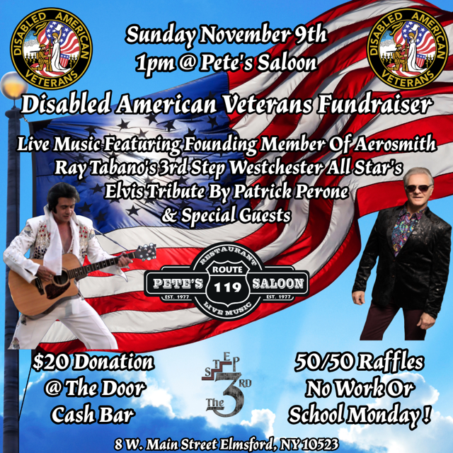 On Sunday afternoon Nov 9th from 1 to 4 pm. Aerosmith founding member Ray Tabano will host his annual fundraiser for Disabled Veterans at Pete’s Saloon in Elmsford. Tabano will lead an All Star Band along with “Elvis “ impersonator extraordinaire Pat Perone performing his greatest hits. Once again the Rolling Thunder representative Ed O’Neill will have the MIA Display as a reminder of the service our Vets have done for our beloved Country Great food, raffles and of course our wonderful DAV Veterans will be there, it’s a great way to spend the day and help support our Veterans. Come on by and by part of the celebration of Veterans Day Weekend. And God Bless America!