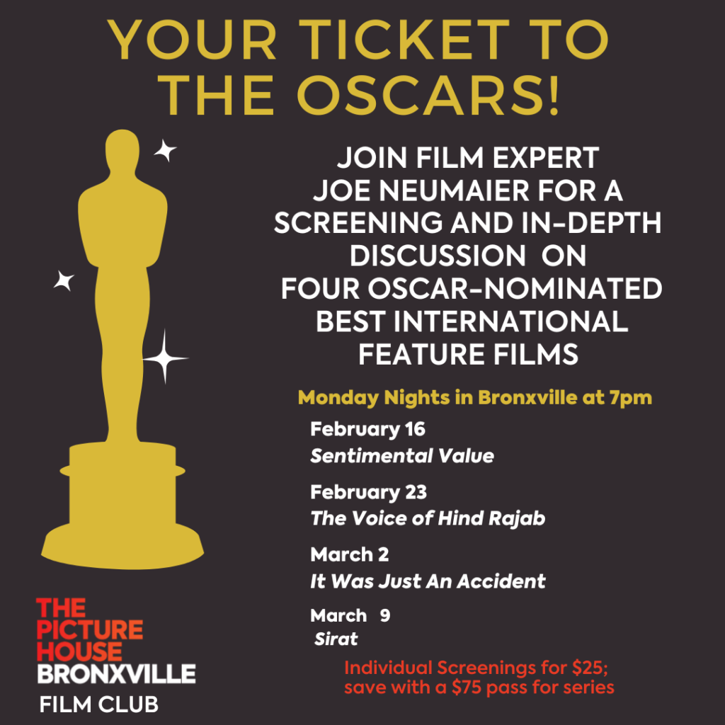 The Picture House Regional Film Center is thrilled to announce the return of Your Ticket to the Oscars, a special four-week Film Club series spotlighting 2026 Academy Award–nominated International Feature films. Now in its second year, the series kicks off Monday, February 16, at 7:00 PM at The Picture House Bronxville and continues weekly through March 9, leading up to the 98th Academy Awards on Sunday, March 14.